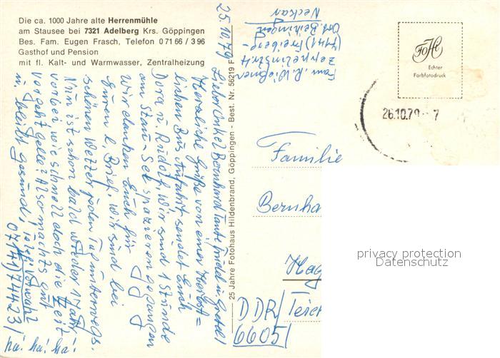 73645153 alte Postkarte Adelberg Gasthaus Herrenmuehle am Stausee postalisch gelaufen Erhaltung siehe scans [WerneD78] KatCode: 11110008117001