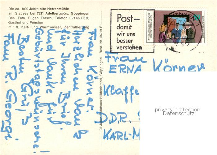 73645143 alte Postkarte Adelberg Herrenmuehle am Stausee Gasthof postalisch gelaufen Erhaltung siehe scans [WerneD78] KatCode: 11110008117001