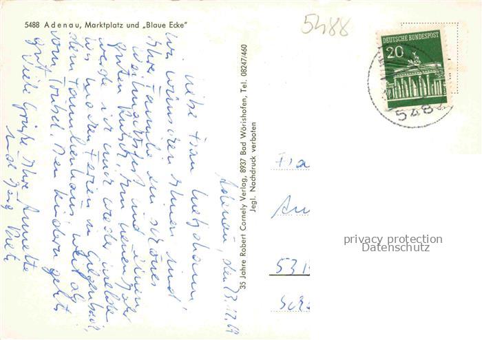 74053234 alte Postkarte Adenau Ahrweiler Rheinland-Pfalz Marktplatz und Blaue Ecke Altstadt Fachwerkhaeuser postalisch gelaufen Erhaltung siehe scans [FriedD77] KatCode: 11110007131001