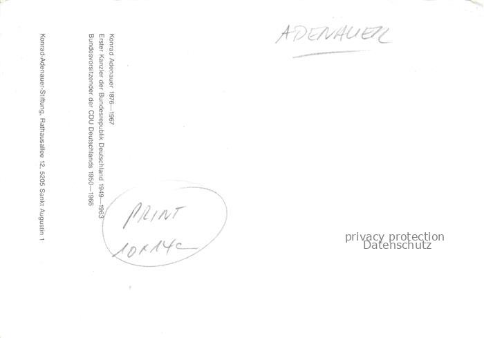 74092258 ADENAUER Konrad (1876-1967) Politik Deutschland CDU Bundesvorsitzender CDU DD postalisch nicht gelaufen Erhaltung siehe scans [SanaeD93] KatCode: 11110011000000