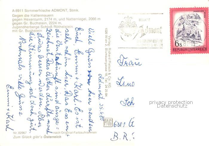 73592412 alte Postkarte Admont Steiermark mit Hallermauern Hexenturm Natterriegel Gr Buchstein Jugendherberge Schloss Roethelstein postalisch gelaufen Erhaltung siehe scans [WerneD78] KatCode: 11390222061201