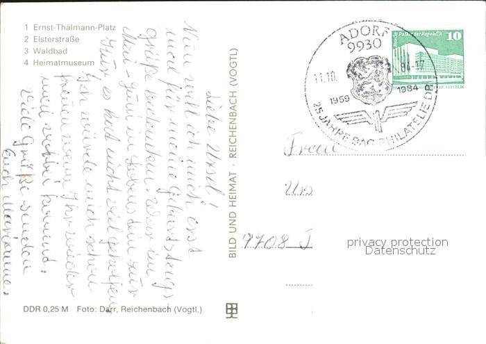 72385491 alte Postkarte Adorf Vogtland Ernst Thaelmann Platz Elsterstrasse Waldbad Heimatmuseum postalisch gelaufen Erhaltung siehe scans KatCode: 11110014178010
