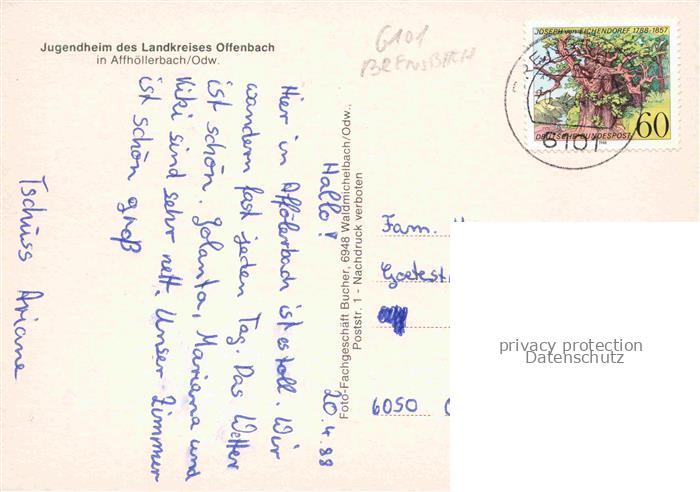 74043437 alte Postkarte Affhoellerbach Brensbach Odenwald Hessen Jugendheim des Landkreises Offenbach Schlafraum Aufenthaltsraum Sporthalle Speisesaal postalisch gelaufen Erhaltung siehe scans [FriedD77] KatCode: 11110006437003