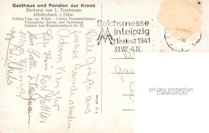 33088980 alte Postkarte Affolterbach Gasthaus Pension Krone postalisch gelaufen Erhaltung siehe scans [LiesaD40] KatCode: 11110006431021