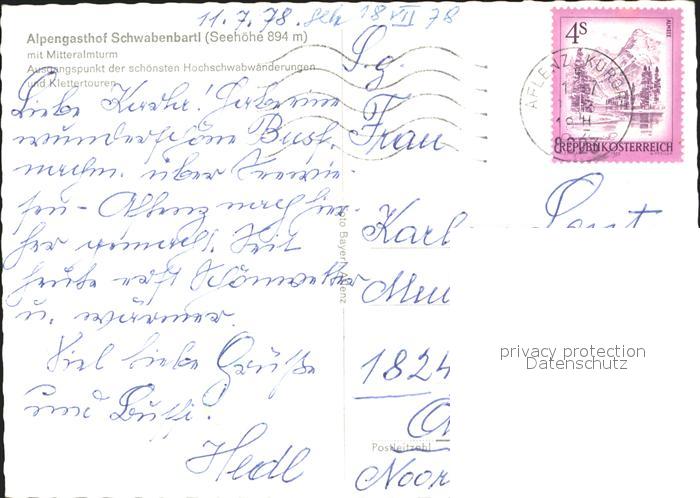 72238887 alte Postkarte Aflenz Steiermark Alpengasthof Schwabenbartl postalisch gelaufen Erhaltung siehe scans KatCode: 11390223060201