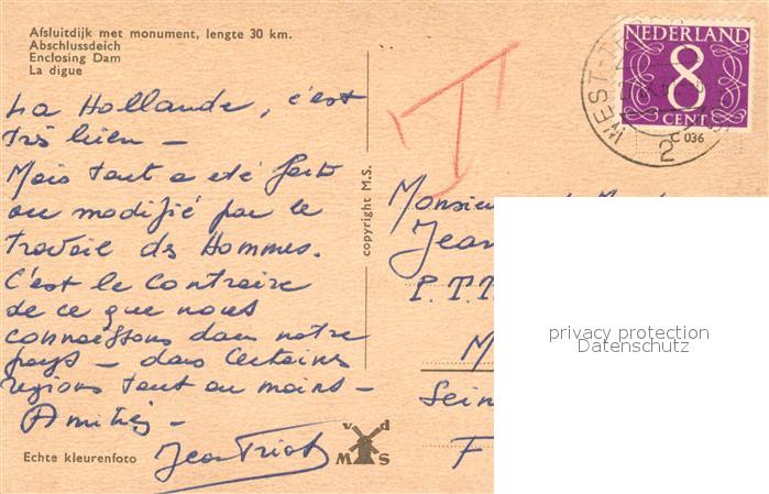 old postcard Afsluitdijk met monument Abschlussdeich postalisch gelaufen Erhaltung siehe scans [FriedD77]