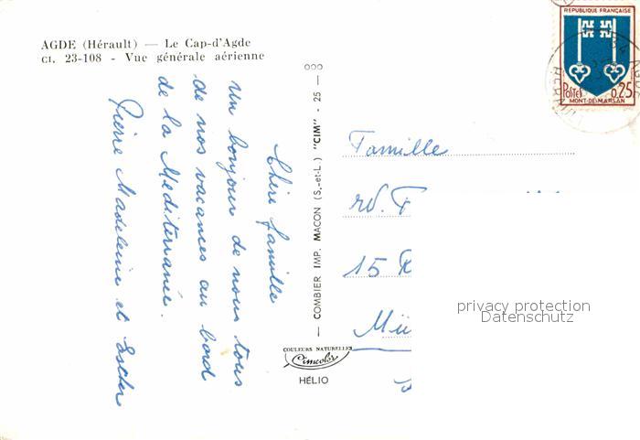 12755145 carte postale Agde Fliegeraufnahme postalisch gelaufen Erhaltung siehe scans [NatalD47] KatCode: 11170034134003