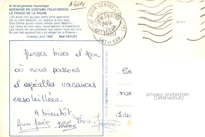 13585718 Agen Lot et Garonne Agenaise Costume Folklorique Triage de la Prune postalisch gelaufen Erhaltung siehe scans [PaolaD17] carte postale Paol Katcode 11170047147001