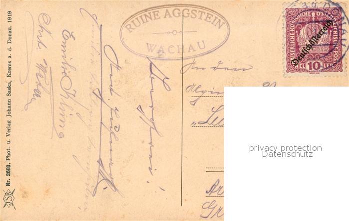 43055265 alte Postkarte Aggsbach-Dorf Ruine Aggstein Wachau Donaupartie postalisch gelaufen Erhaltung siehe scans [FriedD77] KatCode: 11390124031301