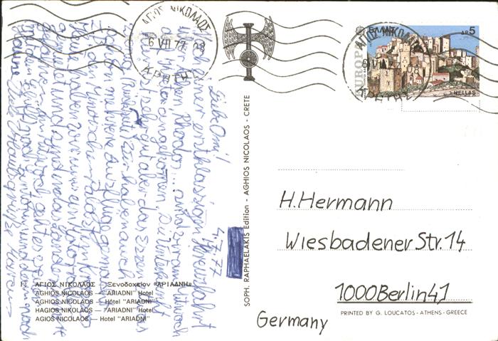 old postcard Agios Nikolaos Hotel Ariadni Strand postalisch gelaufen Erhaltung siehe scans