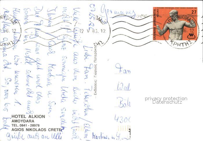 old postcard Agios Nikolaos Kreta Alkion Hotel postalisch gelaufen Erhaltung siehe scans