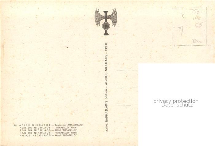 Agios Nikolaos Kreta Hotel Mirabello postalisch nicht gelaufen Erhaltung siehe scans [LiesaD40]