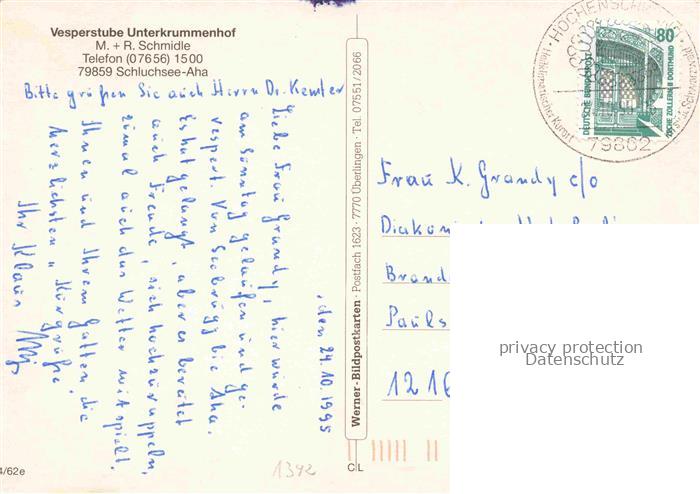 74039637 alte Postkarte Aha Schluchsee Unterkrummenhof Gastraeume postalisch gelaufen Erhaltung siehe scans [WerneD78] KatCode: 11110008315102