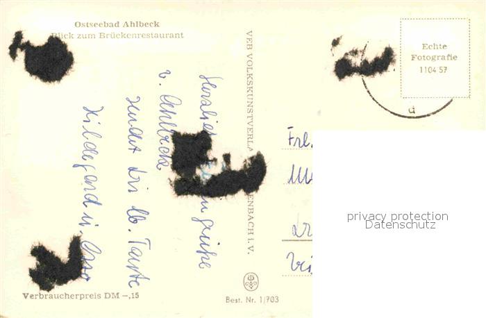 72632194 alte Postkarte Ahlbeck Ostseebad Blick zum Brueckenrestaurant Stranduhr postalisch gelaufen Erhaltung siehe scans [FriedD77] KatCode: 11110013059112