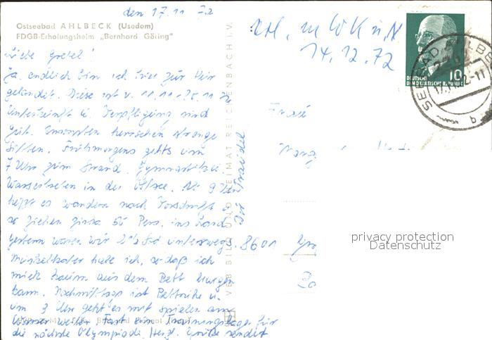 72162797 alte Postkarte Ahlbeck Ostseebad FDGB Erholungsheim Bernhard Goering postalisch gelaufen Erhaltung siehe scans KatCode: 11110013059112