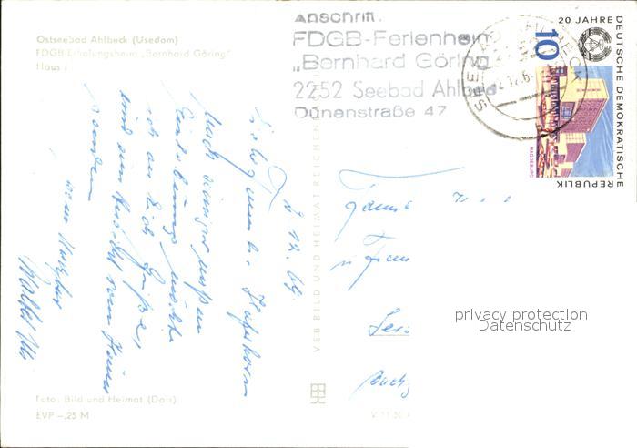 72017942 alte Postkarte Ahlbeck Ostseebad FDGB Erholungsheim Bernhard Goering Haus I postalisch gelaufen Erhaltung siehe scans KatCode: 11110013059112