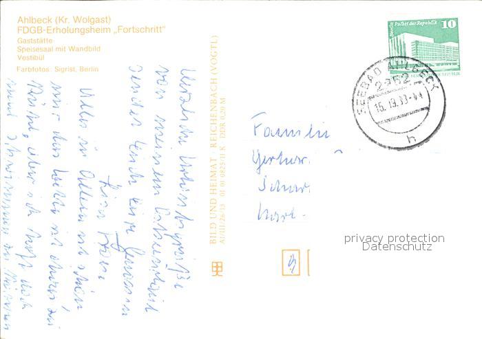 72418364 alte Postkarte Ahlbeck Ostseebad FDGB Erholungsheim Fortschritt Gaststaette Speisesaal Vestibuel postalisch gelaufen Erhaltung siehe scans KatCode: 11110013059112