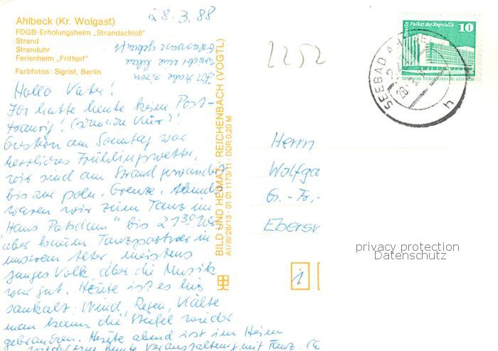 73863655 alte Postkarte Ahlbeck Ostseebad FDGB Erholungsheim Strandschloss Strand Stranduhr Ferienheim Frithjof postalisch gelaufen Erhaltung siehe scans [WerneD78] KatCode: 11110013059112