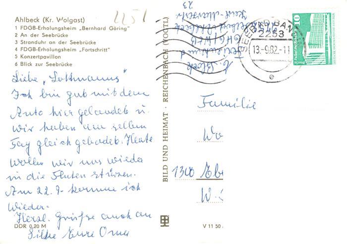 73879489 alte Postkarte Ahlbeck Ostseebad FDGB Erholungsheime Seebruecke Stranduhr Konzertpavillon postalisch gelaufen Erhaltung siehe scans [FriedD77] KatCode: 11110013059112