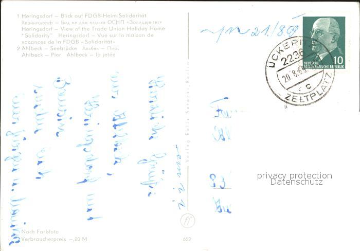 72417003 alte Postkarte Ahlbeck Ostseebad FDGB-Heim Solidaritaet Ahlbeck Seebruecke Pier postalisch gelaufen Erhaltung siehe scans KatCode: 11110013059112