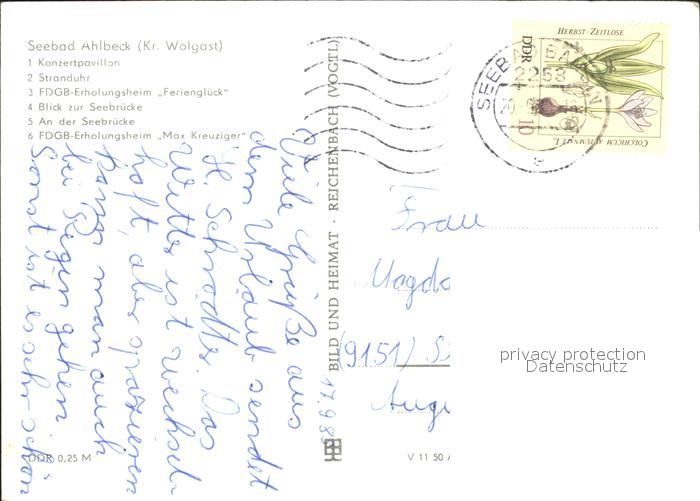 72328794 alte Postkarte Ahlbeck Ostseebad Konzertpavillon Stranduhr FDGB Erholungsheim Seebruecke Strand postalisch gelaufen Erhaltung siehe scans KatCode: 11110013059112