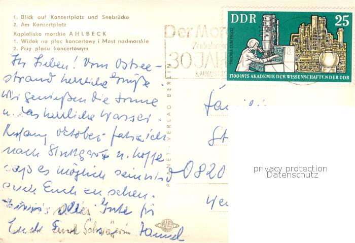 73295811 alte Postkarte Ahlbeck Ostseebad Konzertplatz und Seebruecke Strandpartien postalisch gelaufen Erhaltung siehe scans [WerneD78] KatCode: 11110013059112