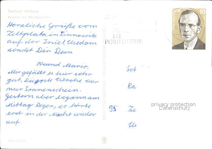 72382835 alte Postkarte Ahlbeck Ostseebad Kurpark und Musikpavillon postalisch gelaufen Erhaltung siehe scans KatCode: 11110013059112