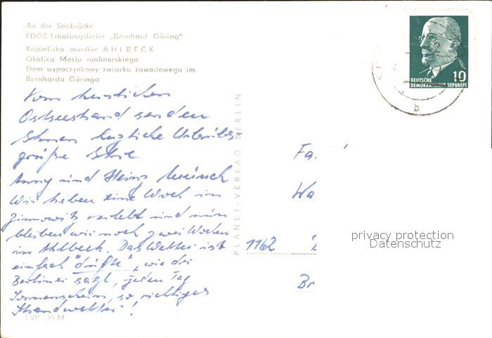 72332177 alte Postkarte Ahlbeck Ostseebad Seebruecke Strand FDGB Erholungsheim Bernhard Goering postalisch gelaufen Erhaltung siehe scans KatCode: 11110013059112