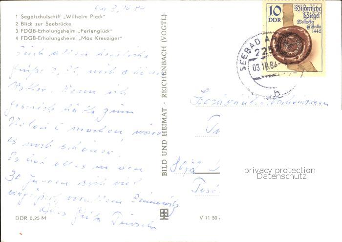 72446956 alte Postkarte Ahlbeck Ostseebad Segelschulschiff Wilhelm Pieck Seebruecke FDGB Erholungsheim Ferienglueck Max Kreuziger postalisch gelaufen Erhaltung siehe scans KatCode: 11110013059112