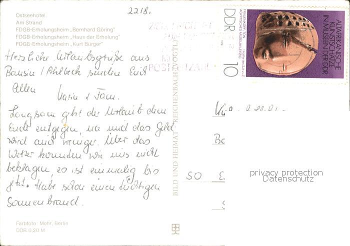 72126131 alte Postkarte Ahlbeck Ostseebad Strand Erholungsheime Bernhard-Goering Haus-der-Erholung Kurt-Buerger postalisch gelaufen Erhaltung siehe scans KatCode: 11110013059112
