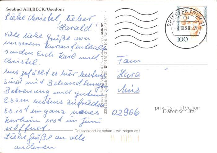 72338666 alte Postkarte Ahlbeck Ostseebad Strand Fischerboot Konzertpavillon Standuhr Seebruecke Turm postalisch gelaufen Erhaltung siehe scans KatCode: 11110013059112