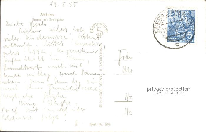72922315 alte Postkarte Ahlbeck Ostseebad Strand mit Seebruecke Boot postalisch gelaufen Erhaltung siehe scans [FriedD46] KatCode: 11110013059112