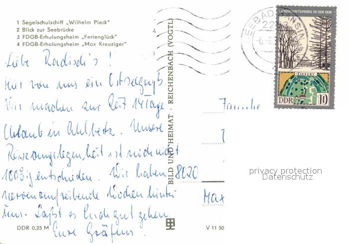 72647437 alte Postkarte Ahlbeck Ostseebad Strand Seebruecke Segelsculschiff-Wilhelm-Pieck Erholungsheime Ferienglueck und Max Kreuziger postalisch gelaufen Erhaltung siehe scans [LiesaD40] KatCode: 11110013059112