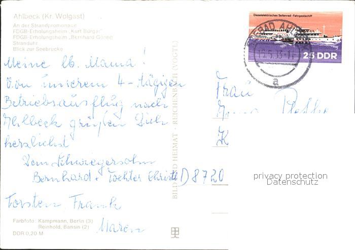 72258034 alte Postkarte Ahlbeck Ostseebad Strand Seebruecke Stranduhr Erholungsheime Kurt Buerger und Bernhard Goering postalisch gelaufen Erhaltung siehe scans KatCode: 11110013059112