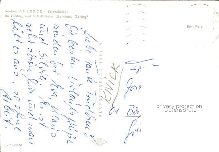 72597299 alte Postkarte Ahlbeck Ostseebad Strandleben FDGB Heim Bernard Goering postalisch gelaufen Erhaltung siehe scans [FriedD77] KatCode: 11110013059112
