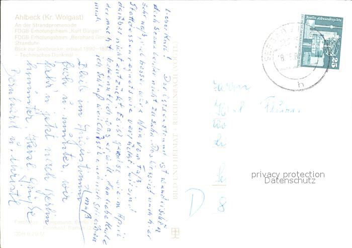 72257745 alte Postkarte Ahlbeck Ostseebad Strandpromenade FDGB Erholungsheim Stranduhr Seebruecke Technisches Denkmal postalisch gelaufen Erhaltung siehe scans KatCode: 11110013059112