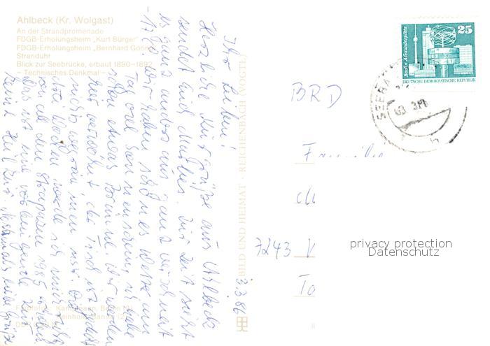 73863669 Ahlbeck Ostseebad Strandpromenade FDGB Erholungsheime Kur Burger und Bernhard Goering Stranduhr Seebruecke postalisch nicht gelaufen Erhaltung siehe scans [WerneD78] KatCode: 11110013059112