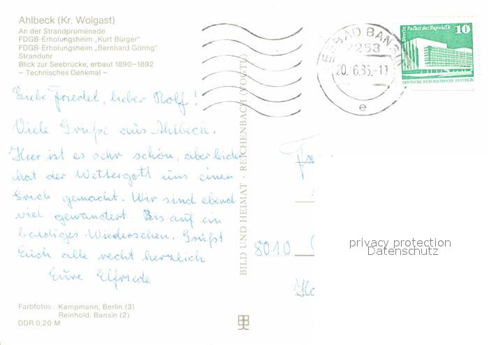 72626523 alte Postkarte Ahlbeck Ostseebad Strandpromenade FDGB Erholungsheime Stranduhr Seebruecke Technisches Denkmal postalisch gelaufen Erhaltung siehe scans [FriedD77] KatCode: 11110013059112