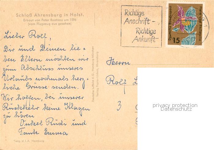 73785076 alte Postkarte Ahrensburg Fliegeraufnahme Schloss Ahrensburg postalisch gelaufen Erhaltung siehe scans [LiesaD40] KatCode: 11110001062001