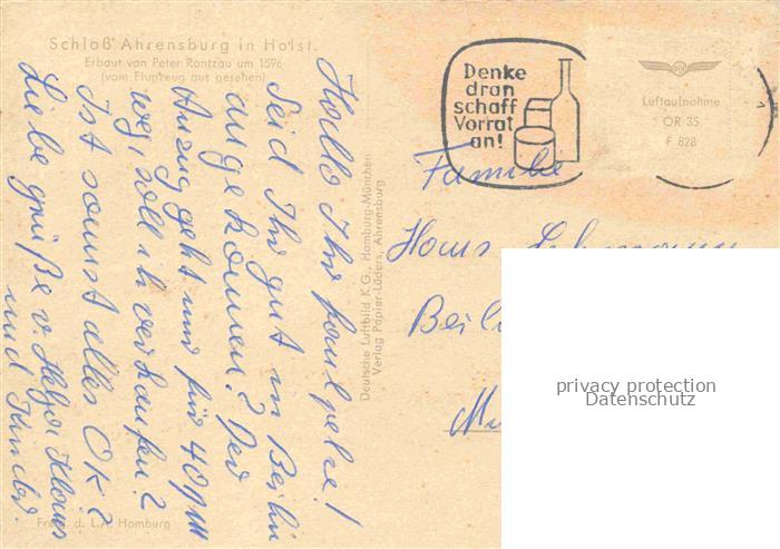 74019316 alte Postkarte Ahrensburg Schloss 16. Jhdt. Erbauer Peter Rantzau postalisch gelaufen Fliegeraufnahme Erhaltung siehe scans [FriedD77] KatCode: 11110001062001
