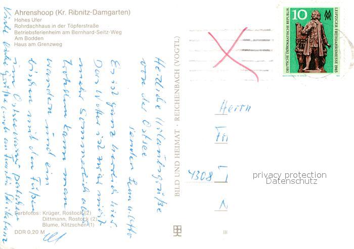 73014757 alte Postkarte Ahrenshoop Ostseebad Hohes Ufer Rohrdachhaus in der Toepferstrasse Betriebsferienheim Bernhard Seitz Weg Am Bodden Haus am Grenzweg postalisch gelaufen Erhaltung siehe scans [WerneD78] KatCode: 11110013057002