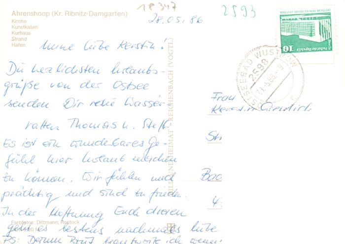 73900234 alte Postkarte Ahrenshoop Ostseebad Kirche Kunstkaten Kurhaus Strand Hafen postalisch gelaufen Erhaltung siehe scans [WerneD78] KatCode: 11110013057002