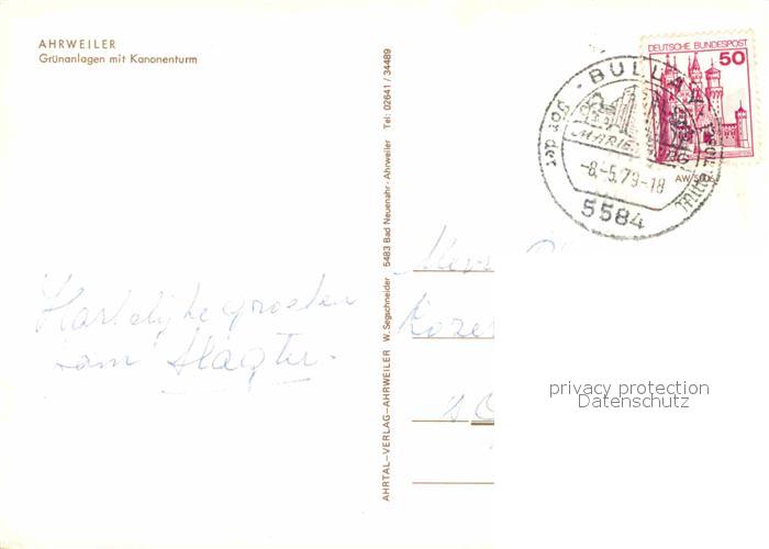 72855897 alte Postkarte Ahrweiler Ahr Gruenanlagen mit Kanonenturm Stadtmauer postalisch gelaufen Erhaltung siehe scans [FriedD77] KatCode: 11110007131007