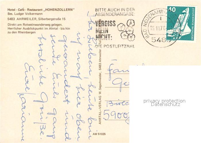73717041 alte Postkarte Ahrweiler Ahr Hotel Cafe Restaurant Hohenzollern Terrasse Weinberge postalisch gelaufen Erhaltung siehe scans [FriedD77] KatCode: 11110007131007