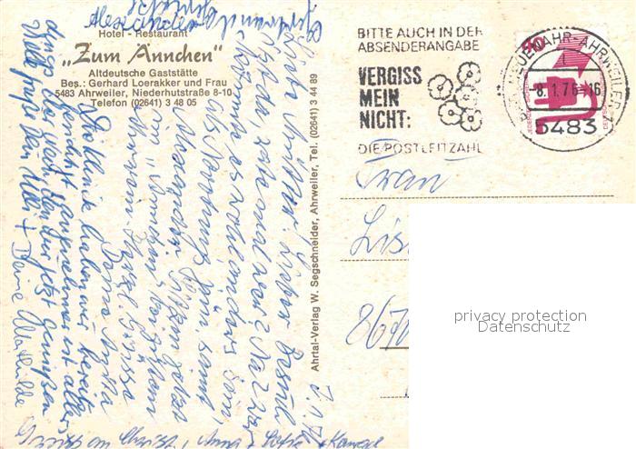 72900292 alte Postkarte Ahrweiler Grafschaft Hotel Restaurant Zum aennchen postalisch gelaufen Erhaltung siehe scans [LiesaD40] KatCode: 11110007131090