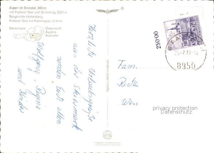 72517890 alte Postkarte Aigen Ennstal Steiermark Putterer-See Grimming Hohenberg postalisch gelaufen Erhaltung siehe scans KatCode: 11390222061203