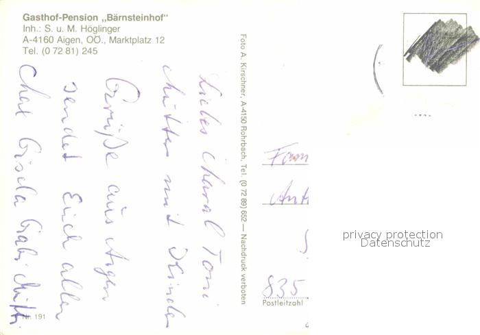 12602847 alte Postkarte Aigen Schlaegl Gasthaus Pension Baernsteinhof postalisch gelaufen Erhaltung siehe scans [LiesaD40] KatCode: 11390313041339