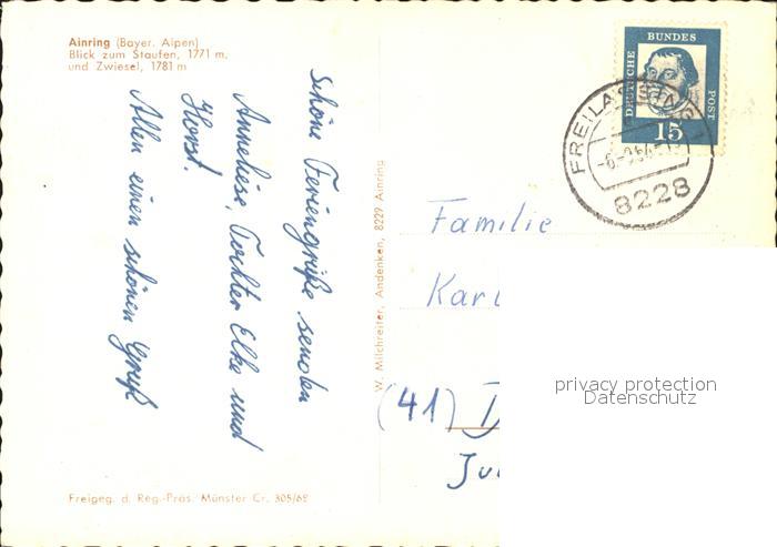 72015737 alte Postkarte Ainring Fliegeraufnahme mit Staufen und Zwiesel postalisch gelaufen Erhaltung siehe scans KatCode: 11110009172111