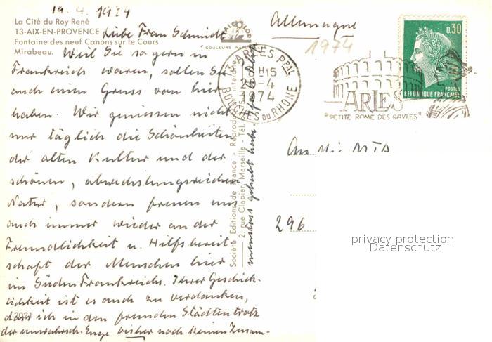 12889507 carte postale Aix-en-Provence Fontaine des neuf Canons sur le Cours Mirabeau postalisch gelaufen Erhaltung siehe scans [LiesaD40] KatCode: 11170013113001