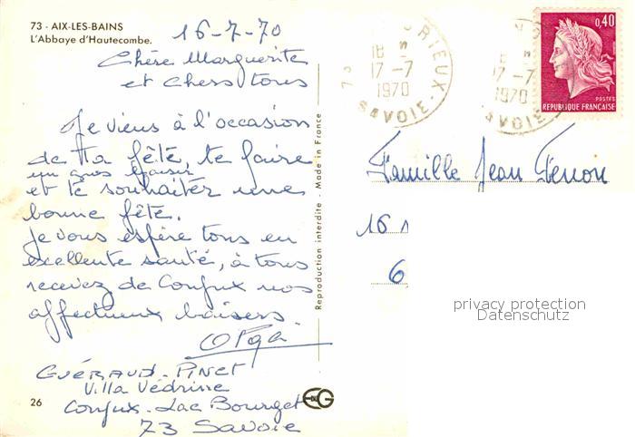 12878359 carte postale Aix-les-Bains Abtei postalisch gelaufen Erhaltung siehe scans [AndreD76] KatCode: 11170073273008